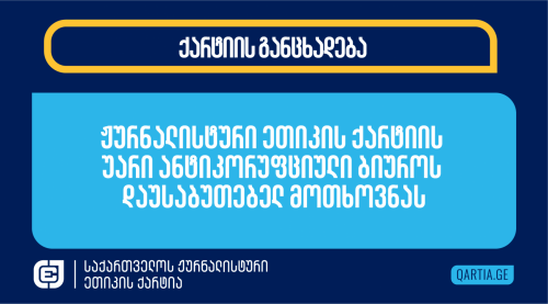 30 სექტებერს საქართველოს ჟურნალისტური ეთიკის ქარტიას ანტიკორუფციული ბიუროდან წერილობით აცნობეს, რომ ბიუროს დაწყებული აქვს წარმოება ორგანიზაციის საქმიანობის გრანტების შესახებ საქართველოს კანონთან შესაბამისობის დადგენის მიზნით. ამ წარმოების ფარგლებში ბიურომ ქარტიისგან გამოთხოვა სხვადასხვა კატეგორიის მოცულობითი ინფორმაცია.