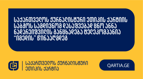 საქართველოს ჟურნალისტური ეთიკის ქარტიას განცხადებით მომართა ანნა ნადარეიშვილმა ტელეკომპანია “იმედის” წინააღმდეგ.